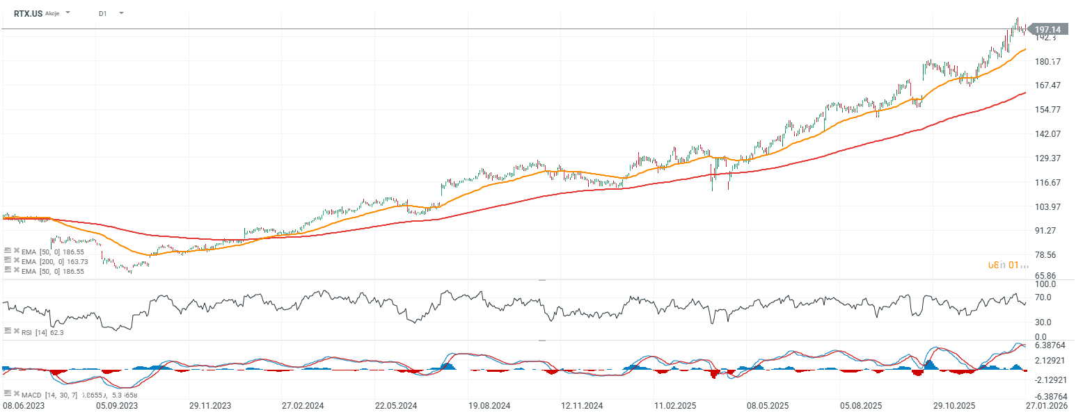 RTX Corp. (RTX.US), the largest U.S. defense prime and formerly Raytheon, delivered better than expected results for Q4 2025 and confirmed that momentum is carrying into 2026. Both revenue and earnings per share beat Wall Street estimates, reinforcing the broader uptrend across the defense space. The company’s most important long-term growth catalyst appears to be the “Golden Dome” program, although uncertainty around its execution, including political friction with Canada and discussions involving Greenland, may delay any valuation premium tied to potential profits from the project. RTX has also recently been singled out by Trump, who described the company as the least willing to align with new White House guidance. That guidance is increasing pressure on defense contractors to invest more aggressively in domestic factories and ramp production capacity as quickly as possible.