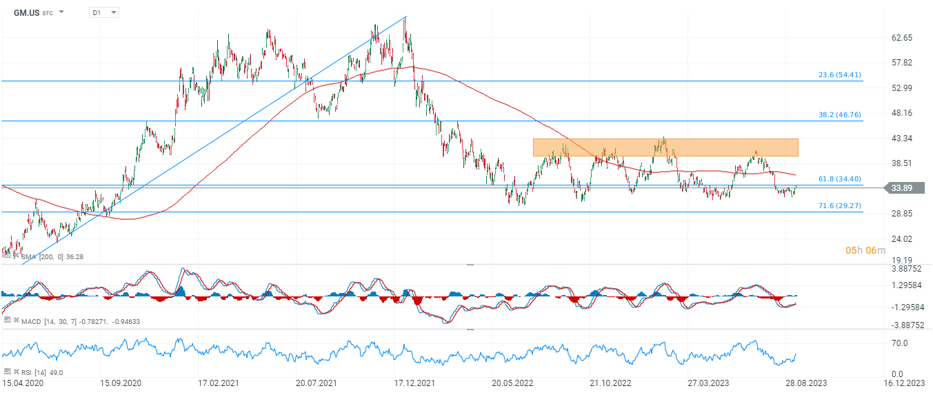 Shares of General Motors (GM.US) are holding near their lows and have reacted with increases several times after reaching support at $30 per share. Source: xStation5