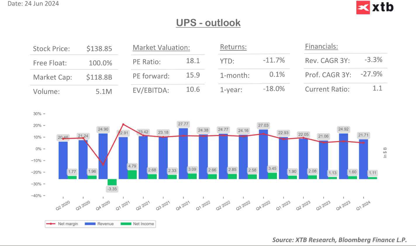 UPS has been in a downward trend since mid-March this year. The company has been facing negative revenue growth and increased competition in the sector for six quarters. Today, however, we can see positive movements on the chart, which allowed the company to break through the short-term resistance level set around $138. The company's stock price continues to remain under strong downward trend pressure, and for now there are no signals strongly favoring the bulls and therefore indicating an occuring of the strong breakout. The catalyst for the further direction of the company's quotations may be tomorrow's FedEx results. Source: xStation