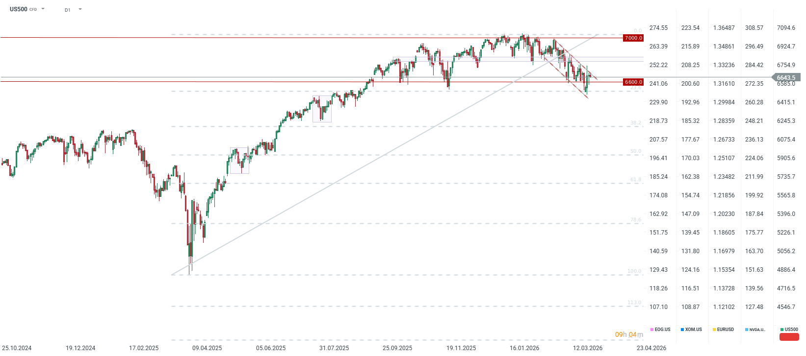 The S&P 500 (US500) remains at a critical juncture. The price is holding above key support linked to the 23.6% Fibonacci retracement level near 6,600 points. Currently, the US500 is moving within a descending trend channel; a breakout above the upper boundary could lead to a retest of the 6,800-point zone.