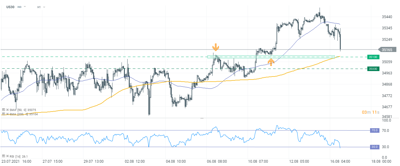 US30 fell below the 50-hour moving average at the beginning of the week. The index is currently trading near the 35,200 pts mark - if declines continue, the area near 35,100 pts may come into play. Traders may find the 200-day moving average (orange line) just nearby. In such scenario, the moving average is worth to watch as it served as a support numerous times in the past. The Dow Jones (US30) index is under pressure today as cyclical stocks lag behind.