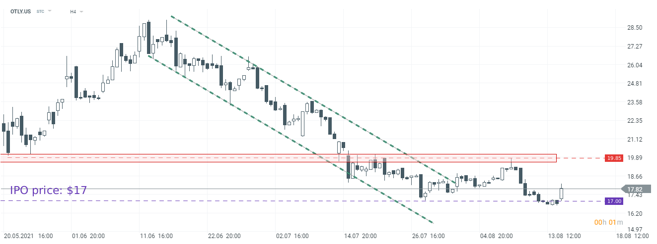 Oatly’s (OTLY.US) IPO took place in May 2021. After initial gains, the stock started to trade in a downward trend. Shares fell more than 40% from its peak and are now near their IPO price ($17). Today shares try to rebound. Source: xStation5