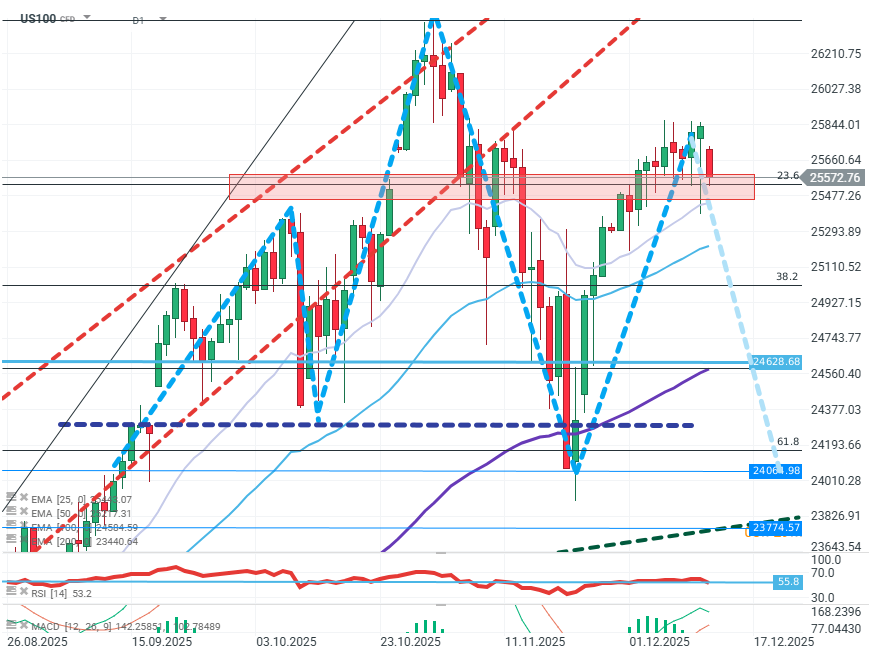 At the beginning of Friday's session in the USA, one can observe the continuation of the nervous sentiment from yesterday. On Thursday, the main Wall Street indices fell by over 1%, but by the end of the session, buyers managed to maintain the initiative. The session opens with a drop in US 100 contract prices by almost 1%. The market may once again try to discount the sustainability of the AI boom and whether the cuts expected by the FED are adequate to the economic condition.