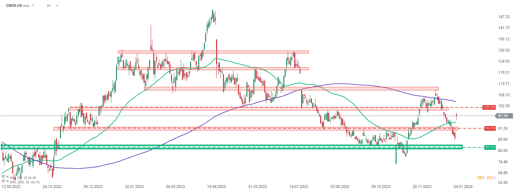 Crocs shares (CROX.US) rally after company upgraded full-year revenue outlook. Stock launched today's trading with an over-10% bullish price gap but erased some gains after trading began. A near-term resistance zone to watch can be found ranging below $102.00 mark. Source: xStation5