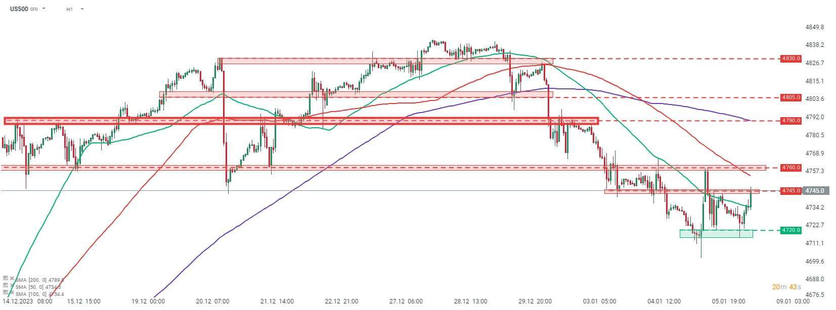 S&P 500 futures (US500) are trading higher today, with gains accelerating after launch of the US cash session. Taking a look at the index at H1 interval, we can see that bulls are attempting to break above the 4,745 pts resistance zone, that was tested a few times recently. Should buyers clear this area, the next resistance in-line can be found in the 4,760 pts area. Breakout would make short-term technical situation more bullish and, given a light newsflow, technicals may play a key role in today's price moves.
