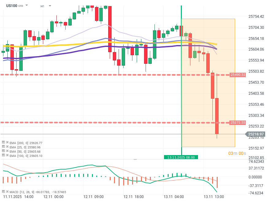 The main downward impulse on Wall Street is the change in expectations regarding the FED's interest rate path. The probability of a rate cut at the December meeting has already dropped to 50% from over 70% just a few weeks ago. Importantly, this is happening alongside the weakening of the dollar.