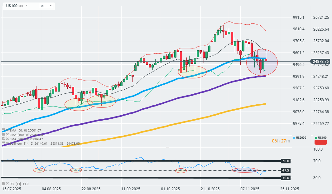 The US100 reverses early euphoric gains following Nvidia's results and is currently losing ground on an intraday basis. Despite strong reports and target price increases for the company, market sentiment is becoming more cautious due to warnings about overheated valuations and the potential risk of sharp declines.