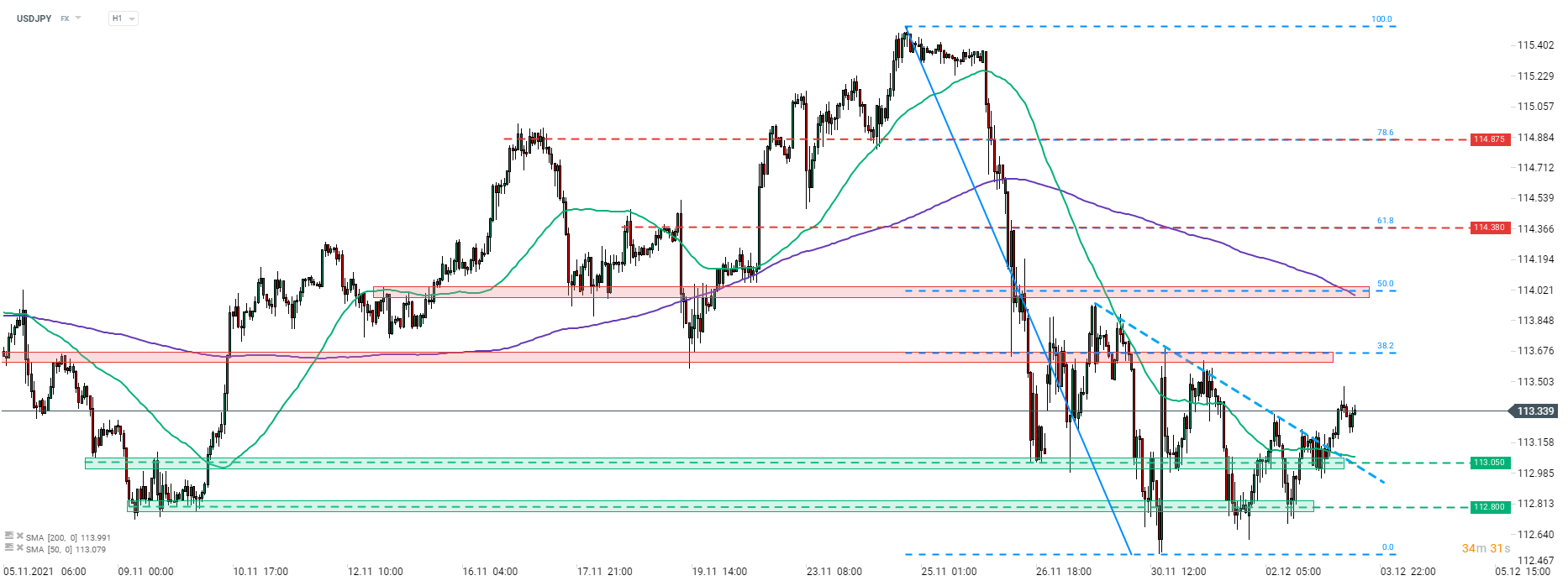 US non-farm payrolls report at 1:30 pm GMT is a key macro event of the day. Market expects another month of solid above-500k jobs growth. Continuation of a strong recovery on the labour market may encourage the Fed to start focusing more on rampant price growth. Fed's Powell said recently that inflation should no longer be seen as transitory. Jobs data will play a big role for the Fed when it makes the next monetary policy decision on December 15, 2021. Solid reading, preferably a beat, could boost already high odds for a hawkish move in mid-December.