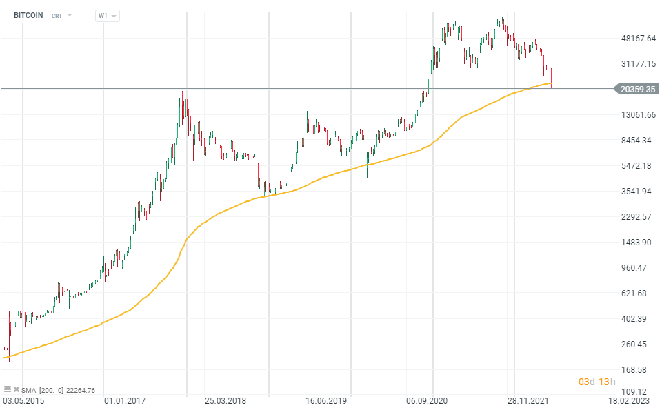Bitcoin has broken multi-year support set by the 200-week moving average (SMA 200). Chart on a logarithmic scale. Source: xStation 5