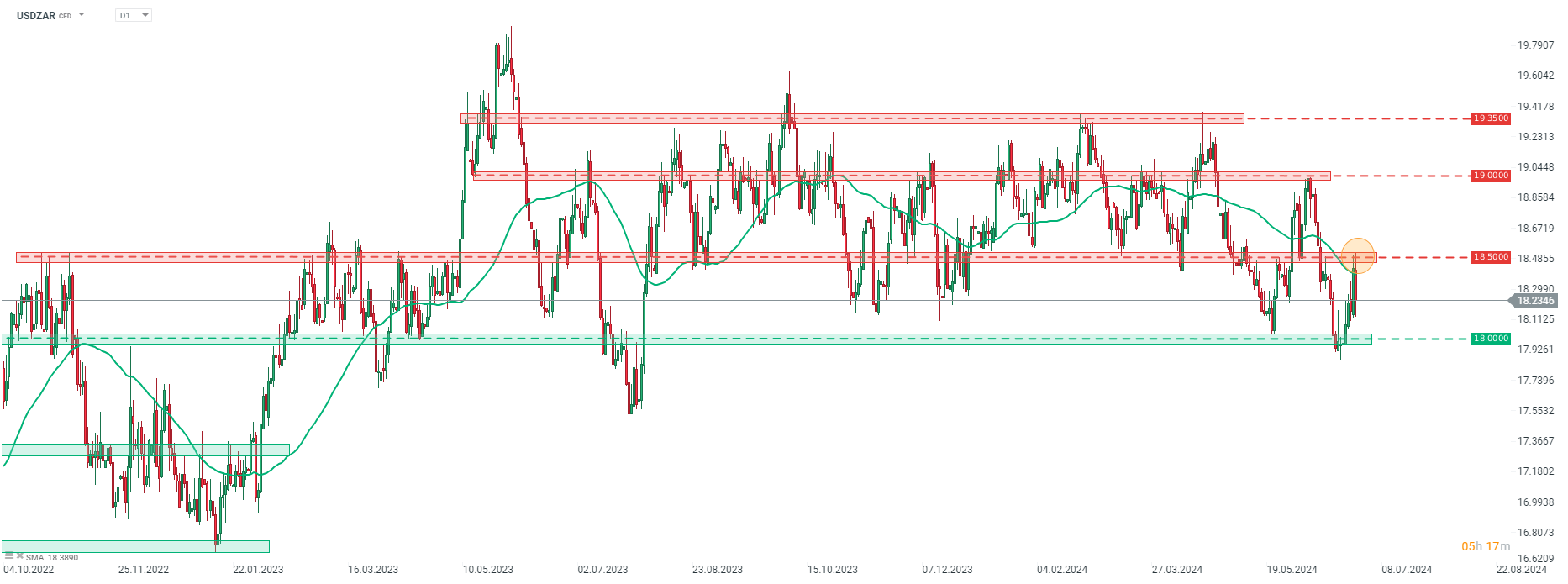 Taking a look at USDZAR chart at D1 interval, we can see that pair attempted to break above the 18.50 resistance zone yesterday and today, but both of these attempts failed, and the pair pulled back below 50-session moving average (green line). A near-term support zone to watch can be found in the 18.00 area and is marked with a number of previous price reactions.