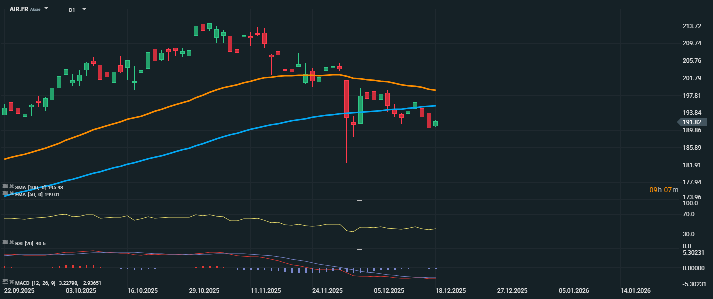 Akcie společnosti Airbus aktuálně oscilují kolem ceny 191,82 EUR, přičemž se nacházejí pod oběma klouzavými průměry – 50denním EMA (199,01 EUR) a 100denním SMA (195,48 EUR). To signalizuje pokračující slabý technický sentiment po předchozím poklesu. Cena se po krátkém zotavení z propadu nedokázala udržet nad SMA 100, která nyní funguje jako rezistence. Současná konsolidace pod touto úrovní zvyšuje riziko dalšího poklesu, pokud se nedostaví výraznější nákupní zájem.