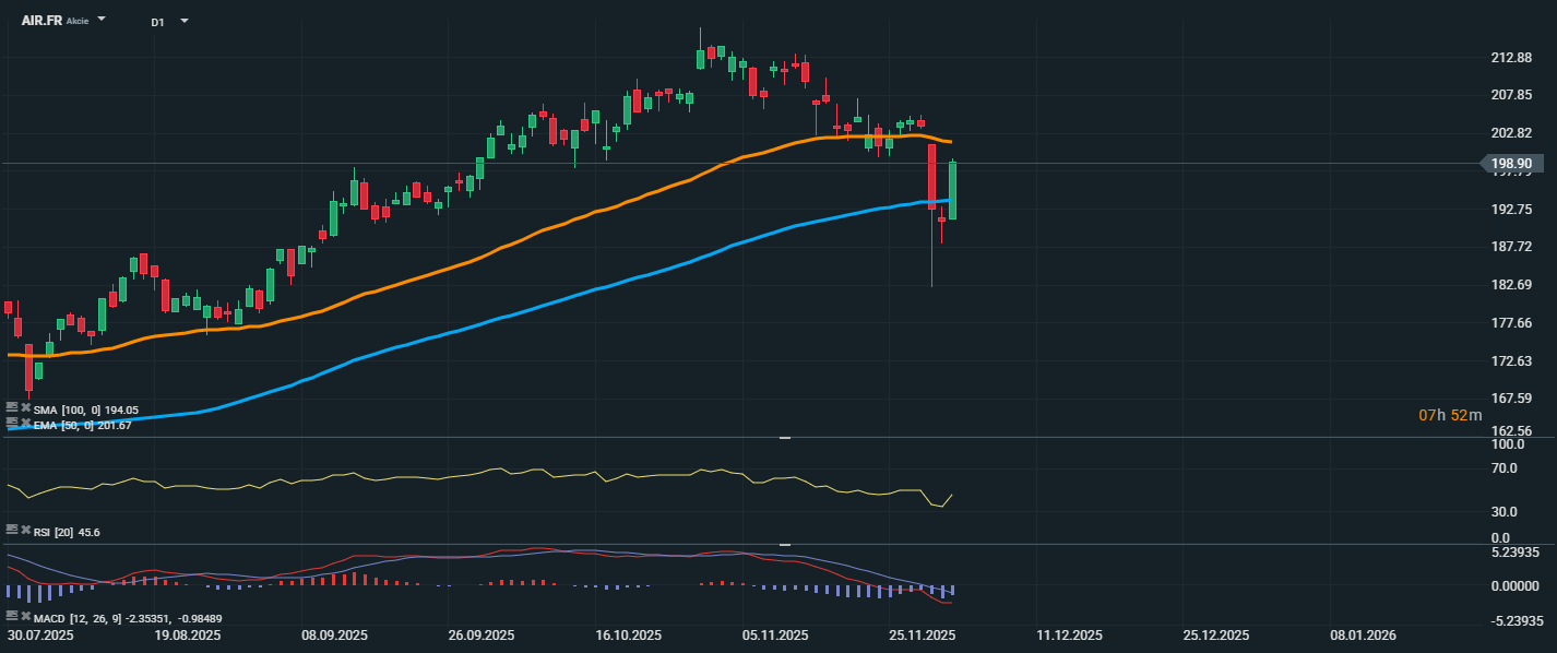 Akcie společnosti Airbus se po prudkém výprodeji způsobeném zprávou o vadných trupových panelech dokázaly částečně zotavit a aktuálně se obchodují za 198,90 EUR. Cena výrazně odskočila od nedávného minima a prorazila zpět nad SMA 100 (194,05 EUR), čímž technicky zpochybňuje předchozí medvědí průlom. Stále se ale nachází pod klouzavým průměrem EMA 50 (201,67 EUR), který může představovat nejbližší rezistenci a zároveň klíčovou úroveň pro obnovení růstového trendu. RSI (45,6) se po předchozím propadu začíná opět zvedat, ale stále se drží pod neutrální úrovní 50.