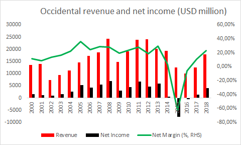 Occidental Petroleum dosahuje v priebehu posledných 20 rokov čistú maržu na úrovni viac ako 20%. Spoločnosť mala problémy v roku 2014, keď ceny ropy výrazne poklesli. Treba však poznamenať, že prevažná časť straty za rok 2015 bola spôsobená znížením hodnoty aktív. Zdroj: Bloomberg, XTB Research