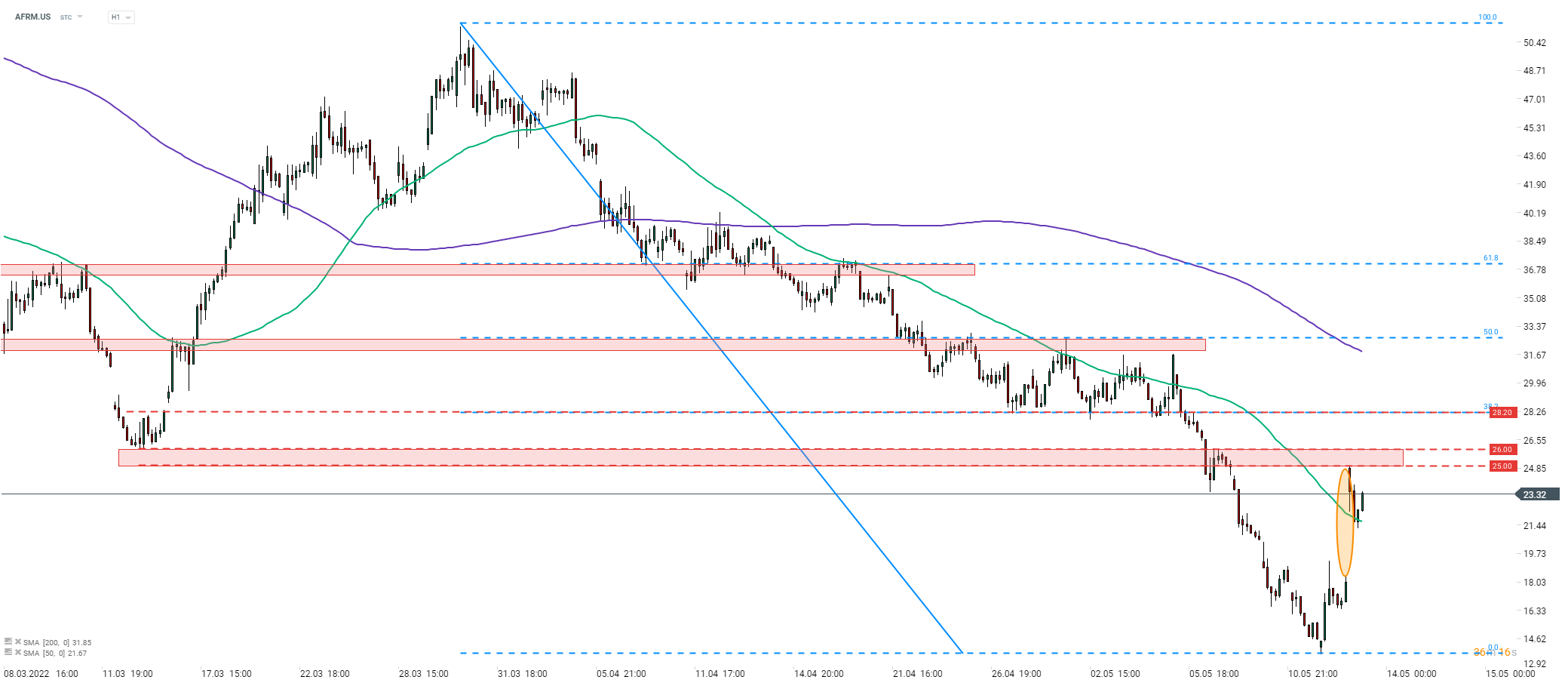Akcie Affirm Holdings (AFRM.US) na začiatku dnešného obchodovania vzrástli o viac ako 30% a testovali zónú odporu 25-26 USD. Býkom sa však nepodarilo prelomiť tento odpor a začal sa pokles. Malo to však krátke trvanie, pretože cena akcií našla podporu na 50-hodinovom kĺzavom priemere (zelená čiara). Spomínaná zóna 25-26 USD je krátkodobá rezistencia, ktorú treba sledovať. Zdroj: xStation5