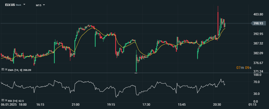 15min graf zobrazující pohyb ceny Elevance Health (ELV.US) dne 6. ledna 2025, analyzováno pomocí EMA (14) a RSI (14). Cena akcie překračuje EMA kolem 20:30, dosahuje maxima 403,80 USD a následně se ustaluje poblíž 398,93 USD. RSI ukazuje překoupené úrovně na 76, než se upraví na 62,5. Zdroj: xStation5