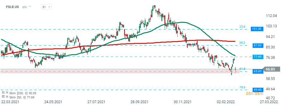 Akcie First Solar (FSLR.US) se od začátku listopadu 2021 pohybují v sestupném trendu. Cena se dnes prudce stáhla zpět a v současné době testuje support na 65,00 USD, což se shoduje s 61,8% Fibonacciho retracementem vzestupné vlny zahájené v březnu 2020. Pokud by došlo k prolomení níže, pohyb dolů může zrychlit směrem k dalšímu supportu na 49,40 USD. Zdroj: xStation5