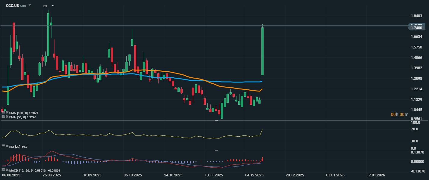 Největší pozornost upoutala společnost Canopy Growth, jejíž akcie obchodované ve Frankfurtu vystřelily až o 17,9 %, čímž dosáhly nejvyšší úrovně od května. Tento růst navázal na páteční skok o 49 %. Později během pondělí akcie část zisků odevzdaly, ale stále si držely meziroční zhodnocení o 8,8 %. Společnosti Tilray Brands a SNDL rovněž navázaly na páteční rally, když posílily o 2,8 % a 3,2 %.