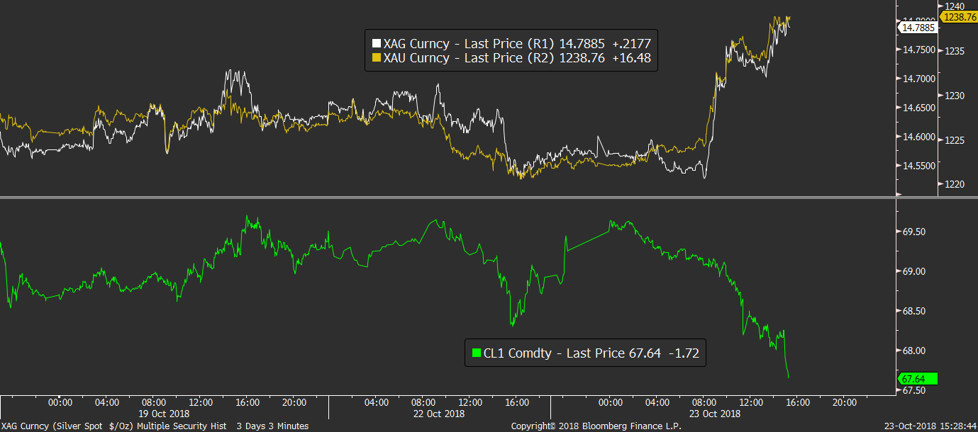 Na komoditním trhu dnes zahajuje další vlnu výprodejů ropa, která doplácí na obavy z případného zvolnění ekonomické aktivity v Číně, zatímco pro změnu růstová vlna zasáhla cenu drahých kovů, které těží ze svého statutu bezpečného přístavu.