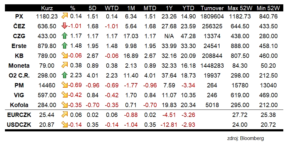 Evropské akciové indexy končí první seanci týdne v pozitivním teritoriu. Nicméně Wall Street otevřela lehce do červených čísel. Trhy negativně ovlivňují ztráty velkých technologických firem a obchodníci vnímají také slova americké ministryně financí Yellenové, která se vyslovila pro prostředí s mírně vyššími úrokovými sazbami. Pražská burza dnes mírně posílila. Index PX (CZKCASH) přidal 0,14 % na 1 180,23 bodů a opět tak navýšil nejvyšší zavírací úrovně od roku 2011. Obchodované objemy dosáhly na podprůměrných 288,4 mil. korun. Pod tlakem se ocitly akcie energetické společnosti ČEZ (CEZ1.CZ;-1,01 % na 636,50 Kč), které však klesly poprvé po 7 růstových seancích. Nedařilo se ani tabákovým akciím Philip Morris (TABAK.CZ;-0,69 % na 14 460 Kč). Z blue chips mají za sebou nejvyšší vzestup akcie O2 (TELEC.CZ;+2,23 % na 298 Kč) a Erste Bank (RBAG.CZ;+1,48 % na 879,80 Kč). Hezky rostla také Česká zbrojovka (CZG.CZ;+1,17 % na 433 Kč). České koruně se dnes dařilo posilovat na páru s americkým dolarem. Naopak zaznamenala mírné oslabení na páru s eurem, i když se stále drží pod úrovni 25,50 EURCZK.