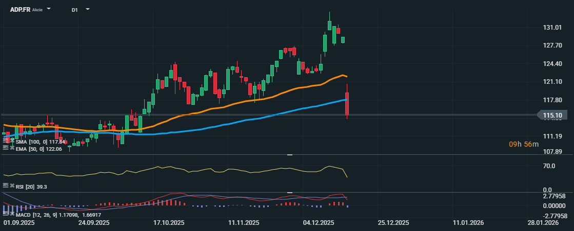 Akcie společnosti Aéroports de Paris zaznamenaly prudký jednodenní propad a aktuálně se obchodují na úrovni 115,10 EUR, což představuje výrazný pokles pod úroveň klouzavého průměru EMA 50 (122,06 EUR) i SMA 100 (117,84 EUR). RSI kleslo na 39,3, tedy pod neutrální zónu, a signalizuje nárůst prodejního tlaku, ale zatím bez dosažení přeprodané oblasti. Z pohledu technické analýzy představuje hladina kolem 115 EUR první krátkodobou podporu. Pokud by se však tlak prodejců dále stupňoval, další významnější úroveň se nachází kolem 111 EUR, což odpovídá předchozímu konsolidačnímu pásmu z října. Pro návrat k pozitivnímu výhledu by bylo potřeba, aby se cena udržela nad EMA 50 a znovu prorazila nad 121 EUR.
