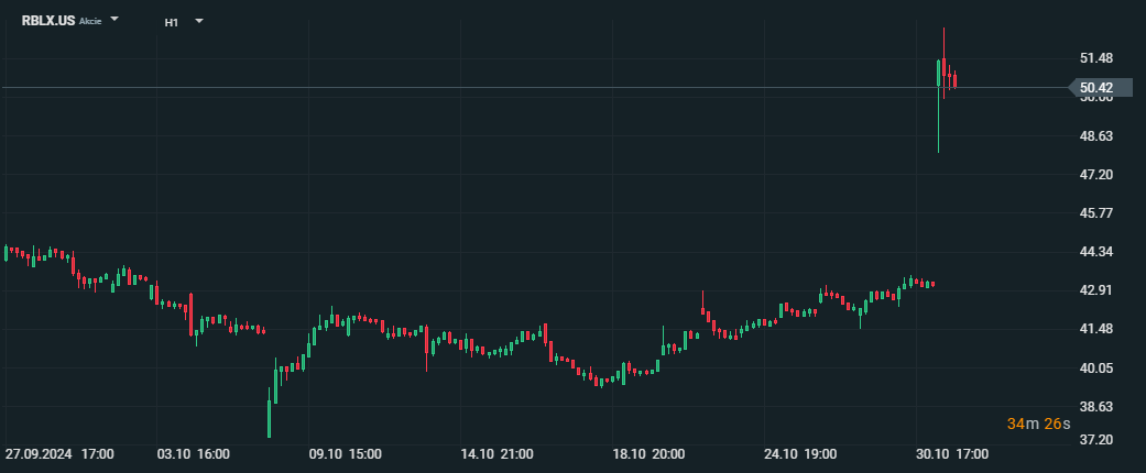 Akcie Roblox Corporation (RBLX.US) dosáhly 52týdenního maxima na úrovni 50,56 USD, což odráží významné zotavení a důvěru investorů v růstové vyhlídky společnosti. Za poslední rok vzrostla hodnota akcií společnosti o 35,49 % díky zvýšené poptávce po digitální zábavě a silným výsledkům třetího čtvrtletí.
