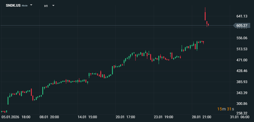 Silná poptávka spolu s napjatou situací na trhu paměťových čipů přispěla k výraznému zlepšení marží. Akcie společnosti se po zveřejnění výsledků dostaly na nová lokální maxima. SanDisk navíc posílil svou dlouhodobou stabilitu prodloužením strategické spolupráce s japonskou společností Kioxia, která má zajistit dodávky paměťových čipů až do roku 2034.