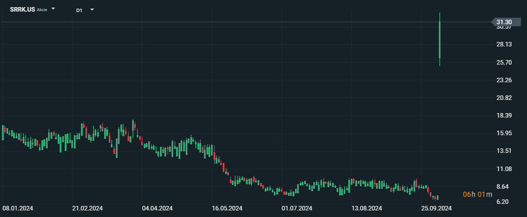 Akcie společnosti Scholar Rock Holding Corp. (SRRK.US) vystřelily o více než 315 % po oznámení pozitivních výsledků z fáze 3 klinické studie SAPPHIRE pro léčivo apitegromab, určené k léčbě spinální svalové atrofie (SMA).