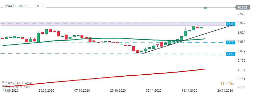 Akcie spoločnosti Credito Valtellinese (CVAL.IT) zahájili dnešné obchodovanie s obrovským vzostupným cenovým rozdielom a dosiahli čerstvé historické maximum. Ak sa však súčasný sentiment na trhu zmení, najbližšia podpora je na hladine 8,96 EUR. Zdroj: xStation5