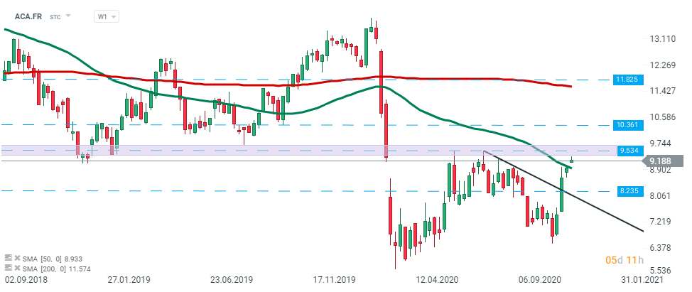 ) sa minulý týždeň podarilo prekonať 50 SMA (zelená čiara), cena sa však odrazila od zóny odporu okolo úrovne 9,53 EUR. Ak by sa kupujúci nedostali nad túto hranicu, krátkodobá podpora sa nachádza na hladine 8,23 EUR. Zdroj: xStation5ACA.FRAkciám spoločnosti Credit Agricole (