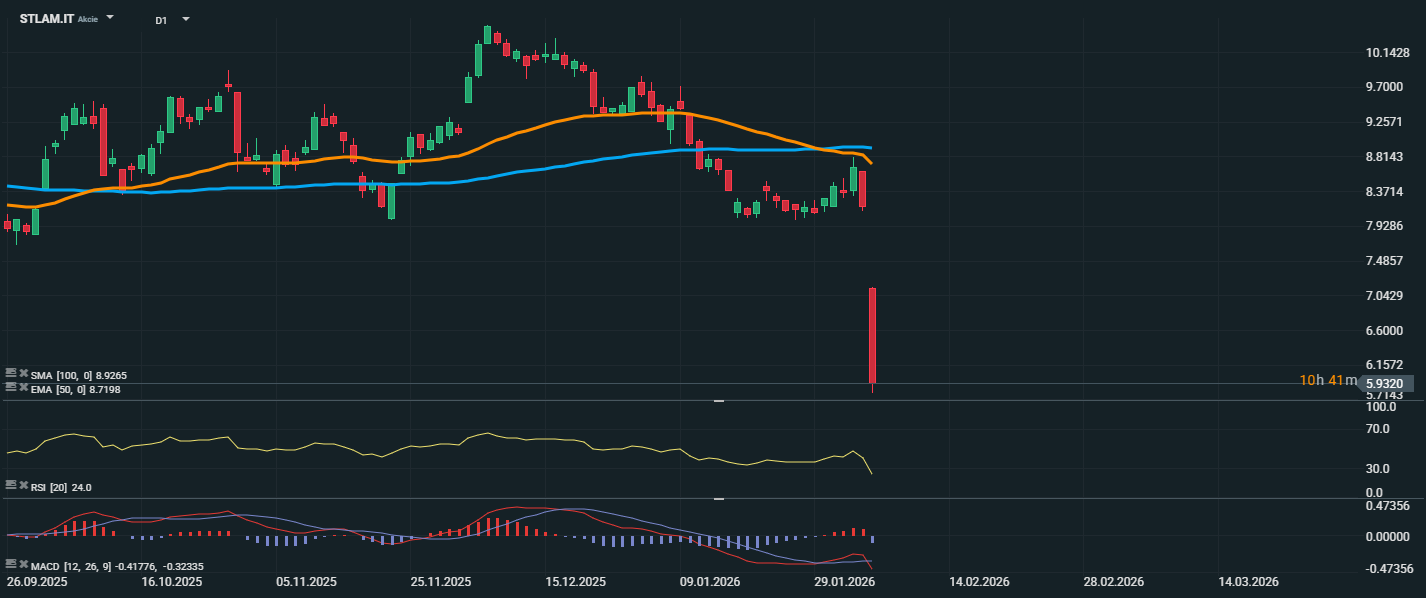 Akcie společnosti Stellantis zažily dramatický propad, když se po oznámení masivního odpisu spojeného s elektromobilitou sesunuly až k úrovni 5,93 EUR, tedy nejníže od května 2020. Cena akcií prudce prorazila pod EMA 50 (8,72 EUR) i SMA 100 (8,93 EUR), čímž došlo k porušení všech klíčových technických podpor. RSI kleslo na hodnotu 24,0, čímž vstoupil hluboko do pásma přeprodanosti. To sice technicky naznačuje možnost krátkodobého odrazu, ale při absenci pozitivního fundamentu zůstává riziko dalšího poklesu vysoké. Z technického hlediska není v grafu zřejmá žádná blízká podpora – další relevantní hladiny se nachází až pod hranicí 5 EUR.