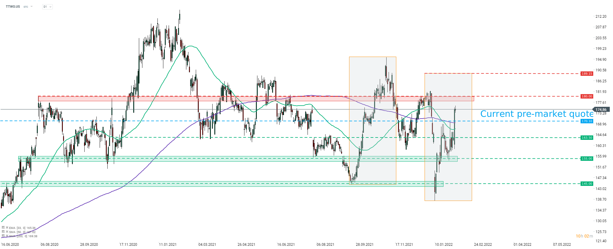 Slabé vyhliadky pre 4. fiškálny štvrťrok a celý fiškálny rok 2022 tlačili na cenu akcií spoločnosti Take Two počas včerajšieho obchodovania v postmarkete. Akcie sa v jednu chvíľu obchodovali o 5 % nižšie. Býci však začali vymazávať straty v dnešnej predobchodnej fázei a teraz sa očakáva, že akcie otvoria v blízkosti kĺzavého priemeru s periódou 200 (fialová čiara) v oblasti 171,10 USD, približne 2,5 % pod včerajšou uzatváracou cenou. Keď sa pozrieme na graf TTWO.US v intervale D1, môžeme vidieť, že akcie za posledný mesiac vzrástli o viac ako 25 % v dôsledku zlepšeného sentimentu voči hernému sektoru v súvislosti so správami o fúziách a akvizíciách. Najbližšia úroveň podpory, ktorú je potrebné sledovať, ak by dnes akcie prehĺbili pokles, sa nachádza v oblasti 163,50 USD. Kľúčová zóna krátkodobej rezistencie sa pohybuje pod hranicou 180,00 USD.