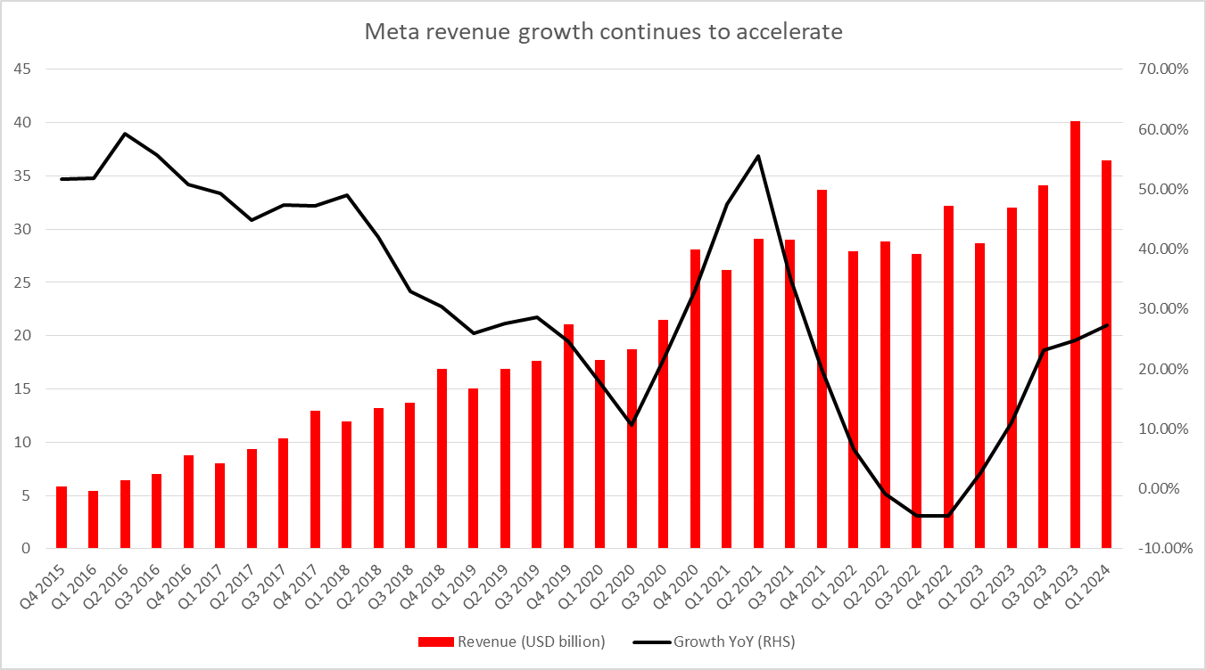 Zatímco růst příjmů Meta Platforms v 1. čtvrtletí 2024 nadále zrychloval, společnost očekává zpomalení ve 2. čtvrtletí 2024. Zdroj: Bloomberg Finance LP, XTB Research