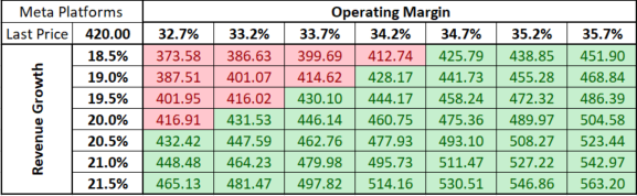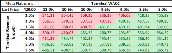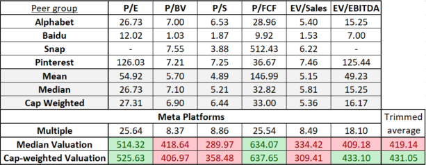 Když se podíváme na tabulku níže, můžeme vidět, že existuje velká volatilita v násobcích pro Meta peer, přičemž společnosti s menší kapitalizací jsou často odlehlé. Prostředky jsou tím nafouknuté. Přesto jsme se rozhodli vypočítat medián a kapitalizací vážené násobky a na nich založit ocenění. Použití násobků mediánu nám poskytuje ocenění v rozmezí od 289,97 USD v případě násobku P/S do 634,07 USD v případě násobku P/FCF. Zkrácený průměr (vyjma nejvyššího a nejnižšího ocenění) nám poskytuje vnitřní hodnotu 419,14 USD na akcii, víceméně v souladu s dnešním zahájením seance (420 USD).