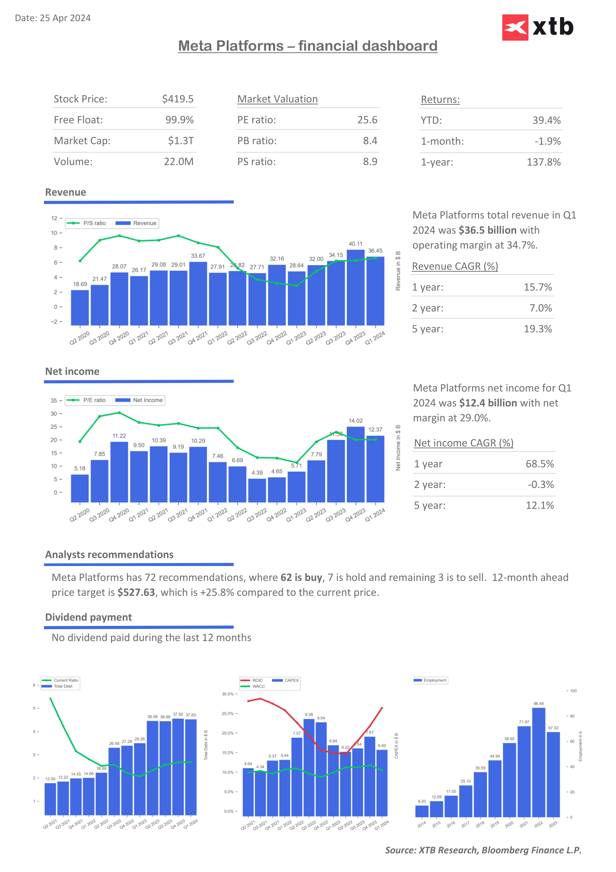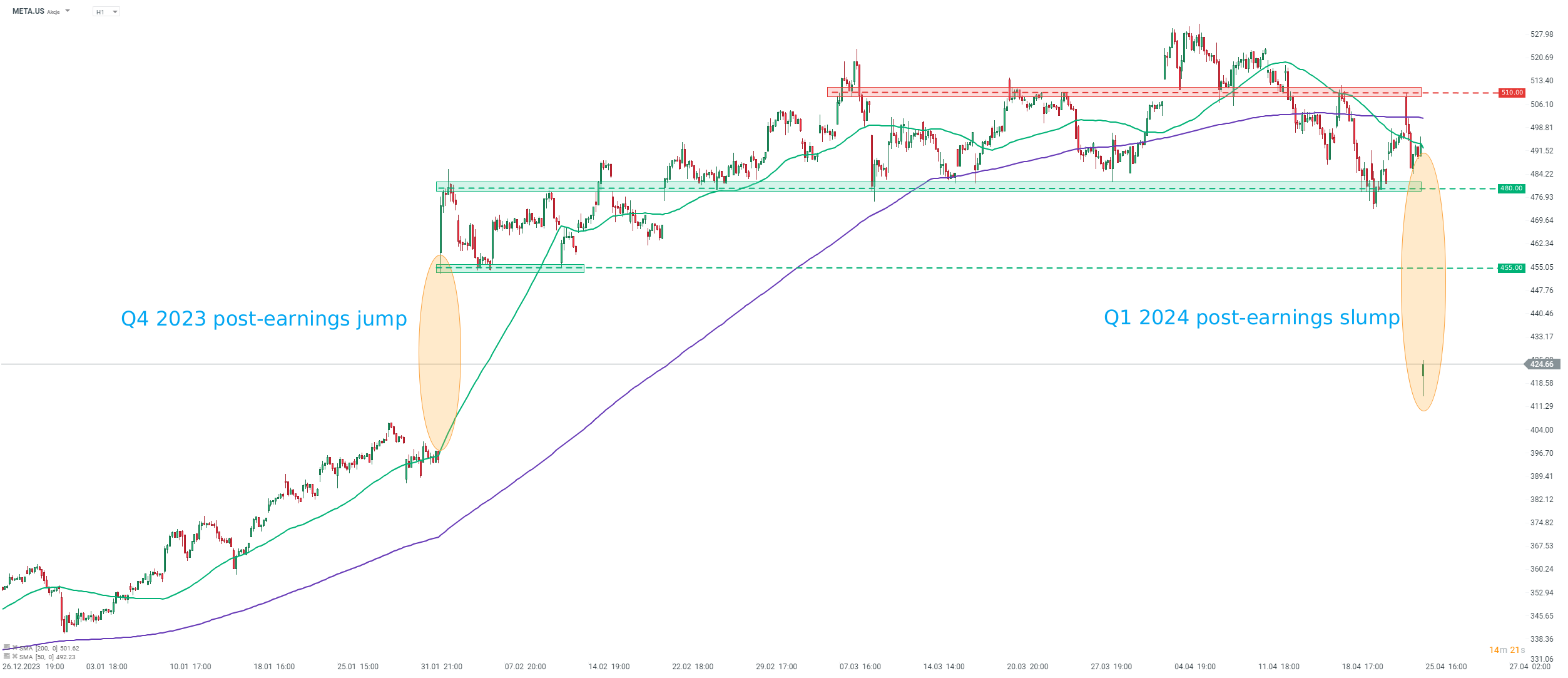 Navzdory těmto většinou lepším výsledkům, než se očekávalo, však cena akcií společnosti Meta v reakci na zveřejnění zisků klesla. Bylo to kvůli poněkud neuspokojivému výhledu na Q2 2024 a celý rok 2024. Společnost očekává, že tržby za 2. čtvrtletí 2024 dosáhnou 36,5–39,0 miliardy USD, což by znamenalo meziroční nárůst o 14–22 %. Střední bod rozpětí prognózy (37,75 miliardy dolarů) byl však pod očekáváním analytiků. Celoroční předpovědi byly také poněkud zklamáním. Společnost zúžila prognózu celkových nákladů v rozmezí od 94-99 miliard USD na 96-99 miliard USD, přičemž střední bod rozpětí (97,5 miliard USD) je nad očekáváním analytiků. Pozitivní je, že celoroční prognóza kapitálových výdajů byla výrazně posílena a překonala očekávání trhů.