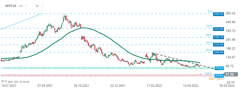 Akcie Upstart (UPST.US) klesli o viac ako 90,0 % zo svojho historického maxima z októbra 2021 a smerujú k historickým minimám, ktoré sa nachádzajú okolo úrovne 23,90 USD. Zdroj: xStation5