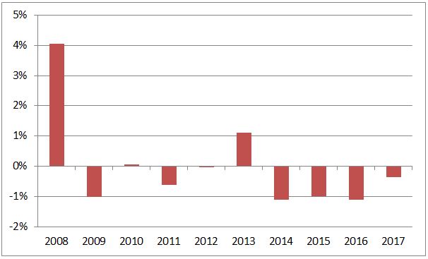 V posledných rokoch sa akciám počas nízkej likvidity koncom roka nezvyklo dariť. V posledných štyroch rokov od Vianoc do konca roka zakaždým stratili. Keď sa pozrieme na posledných 10 rokov, tak klesli až 7-krát. Významný rast zaznamenali len v roku 2008, kedy akcie masívne padali počas finančnej krízy (ďaleko viac ako dnes). Keď nepočítame rok 2008, tak priemer v posledných rokoch je -0,4%.
