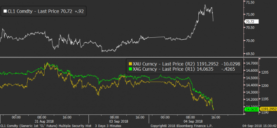 Zajímavá situace dnes panuje také na komoditním trhu, kde silnější dolar začíná opět tlačit dolů cenu drahých kovů. Silná měna ale naopak nevadí ropě, která své zisky i nadále navyšuje a v případě americké WTI roste nad 71 dolarů za barel.