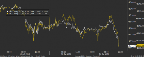 Odpolední zpevnění dolaru pak zanechává jasnou stopu také na drahých kovech. Cena zlata se díky němu znovu propadla pod hranici 1 240 dolarů za unci a pod prodejním tlakem je také stříbro, které klesá pod 16 dolarů a 70 centů.