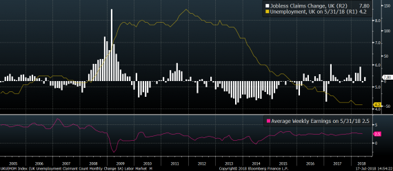 Z makra jsme se dnes zatím dočkali hlavně výsledků z britského trhu práce. Ten zůstává i nadále ve velmi dobré kondici, a to navzdory mírnému zvýšení v počtu žadatelů o podporu. Nezaměstnanost se totiž stabilně drží na pouhých 4,2 % a nijak nepolevuje ani růst mezd, který meziročně dosahoval 2,5 %.