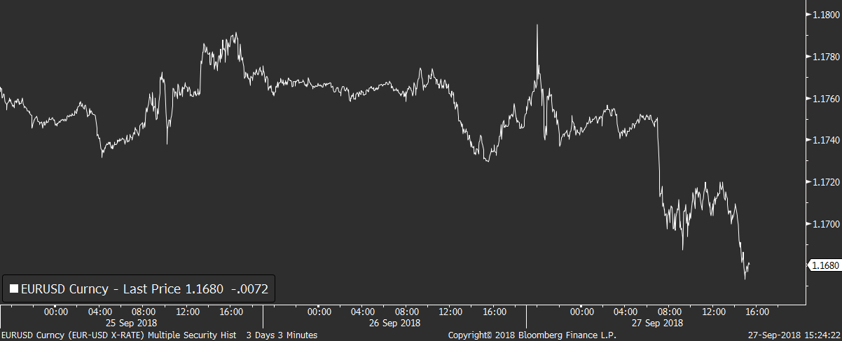 Po včerejším zasedání Fedu na trzích zavládnul klid a pozornost se pomalu přenáší do Evropy a na euro. To dnes na páru s dolarem zamířilo pod 1,17 EURUSD, a to hlavně kvůli zprávám z Itálie, kde tlačí vládní strany na ministra financí, aby povolil navýšení rozpočtového deficitu na rok 2019. Oslabení na euru je doprovázeno růstem italských výnosů, které se u 10 letých splatností přehouply přes 2,9 %. Ve zbytku Evropy výnosy naopak mírně klesají a stejné platí také o USA.