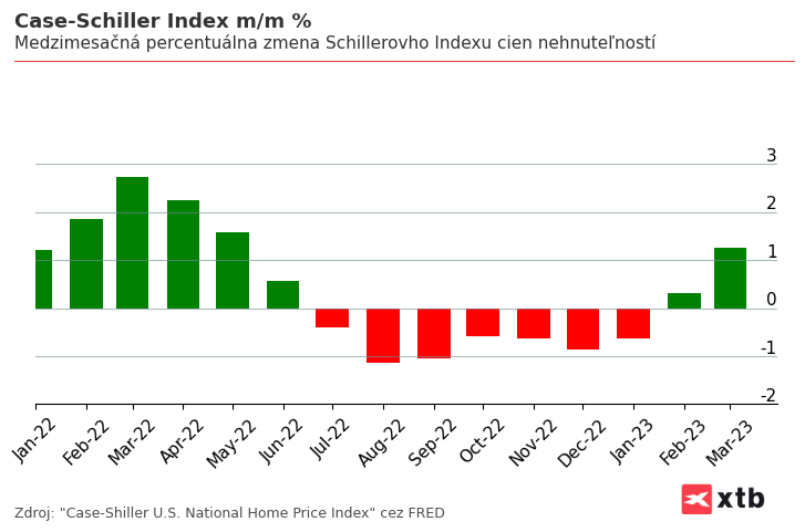 Po miernom poklese v roku 2022 sme svedkami obnoveného rastu indexu cien nehnuteľností Case-Schiller. Aj napriek spomaleným dátam je očakávané, že ceny nehnuteľností budú pokračovať v rastovom trende. Vo februári 2023 tento index medzimesačne vzrástol o 0,32 % a v marci zaznamenal ešte prudší nárast na úrovni 1,26 %. Takýto rast je pozitívnym signálom pre trh s nehnuteľnosťami a naznačuje možný rast dopytu, aj napriek vysokým úrokovým sadzbám.