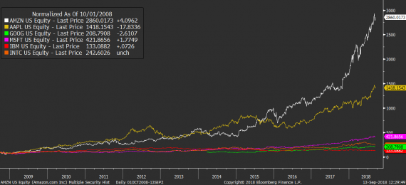 Pokud byste nakoupili AMZN těsně po finanční krizi, máte dnes více než 25 násobek vložené částky. V případě investice do Applu jste na „pouhém“ jedenáctinásobku a o dalších firmách jako Microsoft, Google, IBM, nebo Intel raději ani nemluvě.