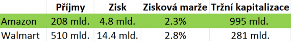 Walmart loni utržil více než 500 mld. dolarů a díky maržím těsně pod 3 % tak vykázal zisk 14 mld. Při více než dvojnásobných tržbách a dokonce i vyšších maržích ale jeho tržní kapitalizace dosahuje pouhých 317 mld. dolarů, což je necelá třetina tržní kapitalizace Amazonu.