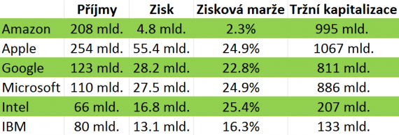 Jen pro představu, AMZN při celkových tržbách ve výši 208 mld. dolarů vykázal za poslední čtyři čtvrtletí zisk ve výši 4,8 mld. dolarů, což představuje 2,3% ziskovou marži. Apple, na druhou stranu, při tržbách 254 mld. dolarů za stejnou dobu vygeneroval zisk 55 mld. dolarů. Google loni vydělat 28 mld., Microsoft 27 mld., Intel 16 mld. a mohli bychom pokračovat. Prakticky všechny velké technologické firmy generují násobně vyšší zisky než Amazon, ale je to právě Amazon, který je všechny přerostl.