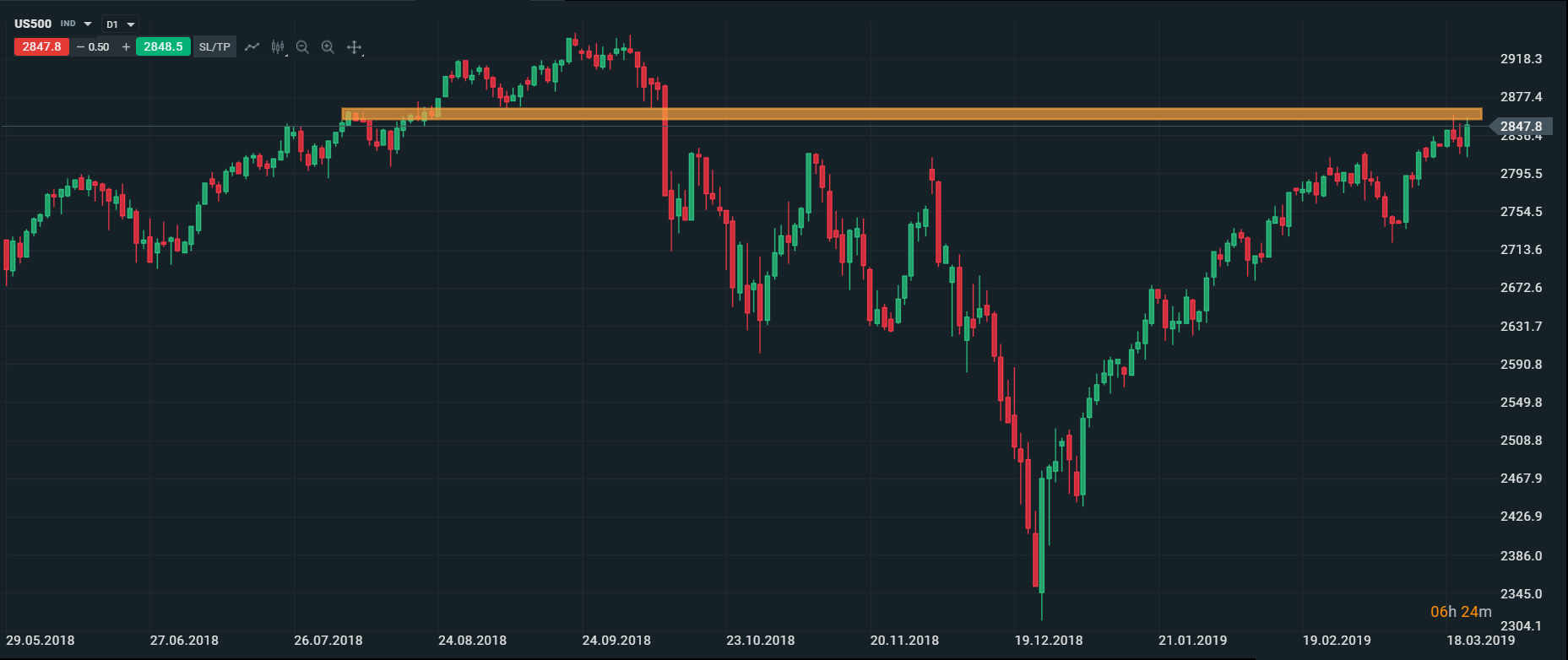 Americké akciové trhy rozširujú zisky kvôli včerajšiemu zasadaniu FOMC. Federálny rezervný systém včera zverejnil prognózu ďalšieho vývoja úrokových sadzieb v ktorej sa uvádza, že FED v tomto roku neočakáva žiadne zvýšenie úrokových sadzieb a v budúcom roku očakáva iba jedno zvýšenie. Americké akciové trhy profitujú z holubičieho vyjadrenia FEDu. Dôvody sú pomerne jasné. Hospodársky rast v USA bude podporovaný súčasnými - nižšími úrokovými sadzbami, čo pozitívne vplýva na spotrebu, ktorá sa prejaví v náraste tržieb spoločností pôsobiacich v USA. Na druhej strane, americkým spoločnostiam sa nezvýšia v tomto roku náklady na obstaranie dlhu, čo vedie k úsporám, a teda k nárastu ziskov. Americký akciový index S&P 500 (US500) sa obchoduje v blízkosti rezistencie na úrovni 2850-2860 bodov. V prípade prerazenia smerom nahor, je možný nárast k úrovni 2900 bodov.