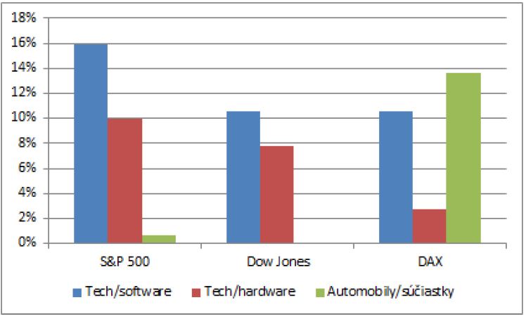 Podiel technologických a automobilových akcií na indexoch indexoch S&P 500, Dow Jones a DAX