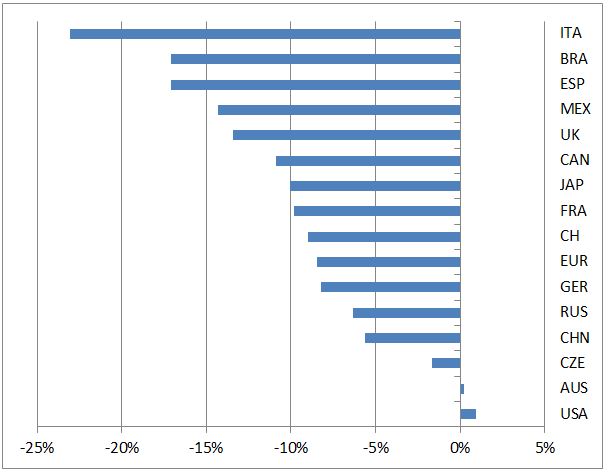 - Podhodnotenie talianskych akcií je väčšie ako podhodnotenie akcií emerging markets (Brazília, Mexiko, Rusko). To ukazuje ako veľmi sa trhy boja novej talianskej vlády