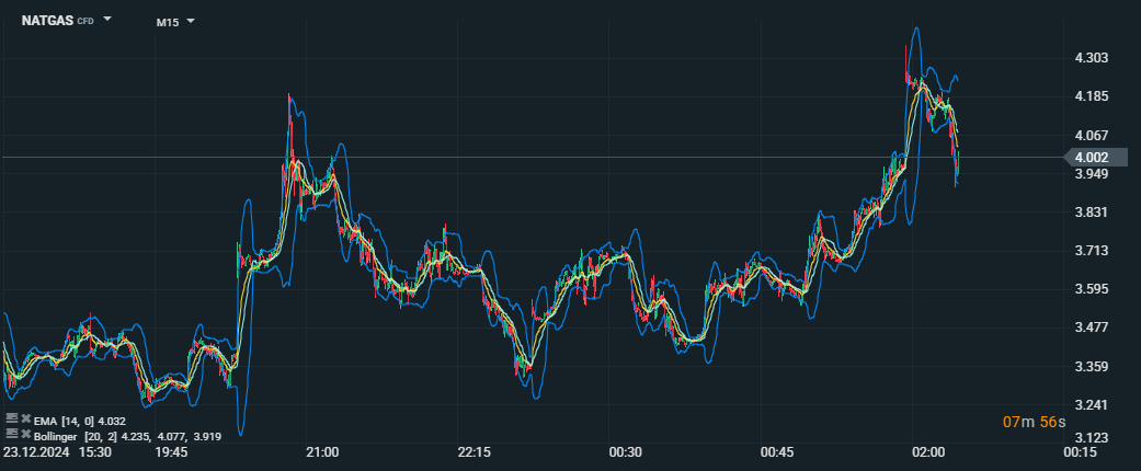 Vývoj ceny futures na zemní plyn (CFD) na 15minutovém grafu s indikátory Bollingerova pásma (perioda 20) a Exponenciální klouzavý průměr (EMA, perioda 14). Graf ukazuje růst cen směrem k 4,032 USD/mmBtu, což odpovídá predikcím spojeným s chladným počasím a zvýšenou poptávkou po zemním plynu. Zdroj: xStation5