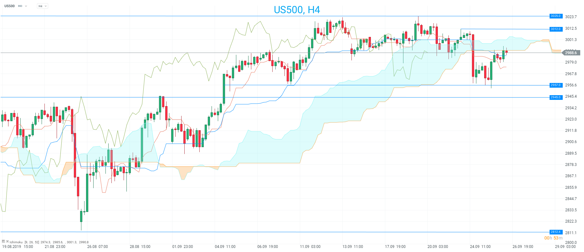 Americké akcie stále zůstávají v širším konsolidačním pásmu, kde se pohybují v posledních týdnech. Cena se nachází pod Ichimoku mrakem na H4 poprvé v tomto měsíci, ale zpožděná linie ještě musí potvrdit průraz. Rezistenci vidíme až k úrovni 3012 bodů a rozmezí 2945 - 2957 by stále mělo hrát roli potenciálního supportu, pokud se index vydá opět na nižší hodnoty. Zdroj: xStation