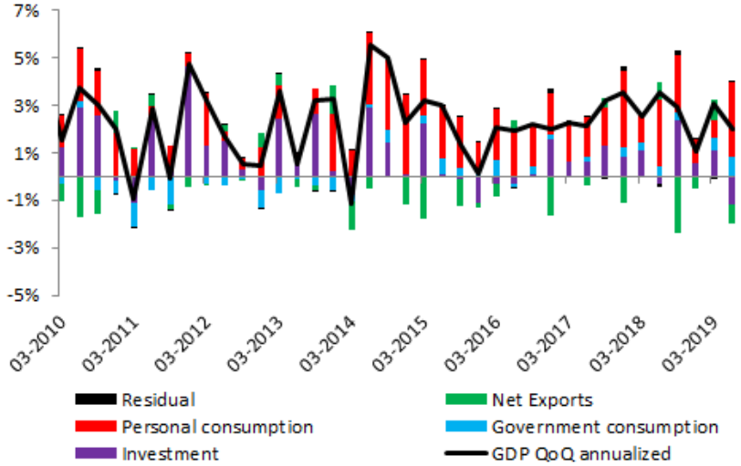 Nejzajímavější je prohloubení růstu podnikatelských investic, které se dostaly do blízkosti nejnižších úrovní za poslední dekádu. Druhým překvapením je růst jádrové osobní spotřeby. Fed uvolňuje měnovou politiku navzdory solidnímu ekonomickému růstu a pracovnímu trhu. Růst jádrových osobních výdajů na 1,9 % stále není něco, čeho by se Fed měl obávat. Nicméně další růst výdajů by mohl přinést inflační tlaky a bude zajímavé, zda se i v následujících čtvrtletích dočkáme dalšího růstu.